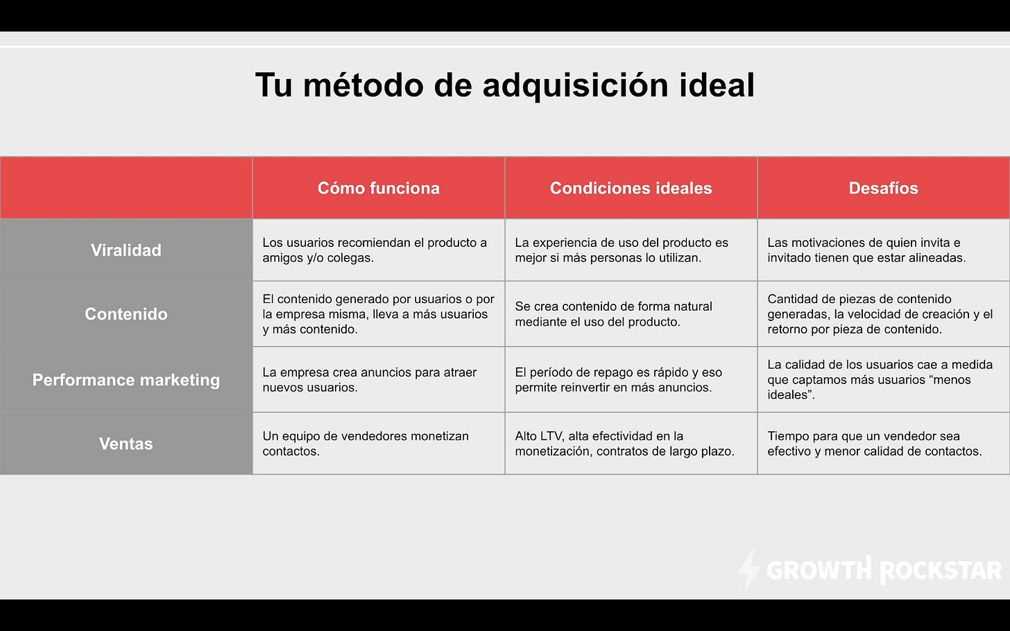 2 años atrás escribí una serie de artículos con mi playbook completo de adquisición, partiendo de los cuatro métodos de adquisición: 1. Viralidad 2. Contenido 3. Paid marketing 4. Ventas.