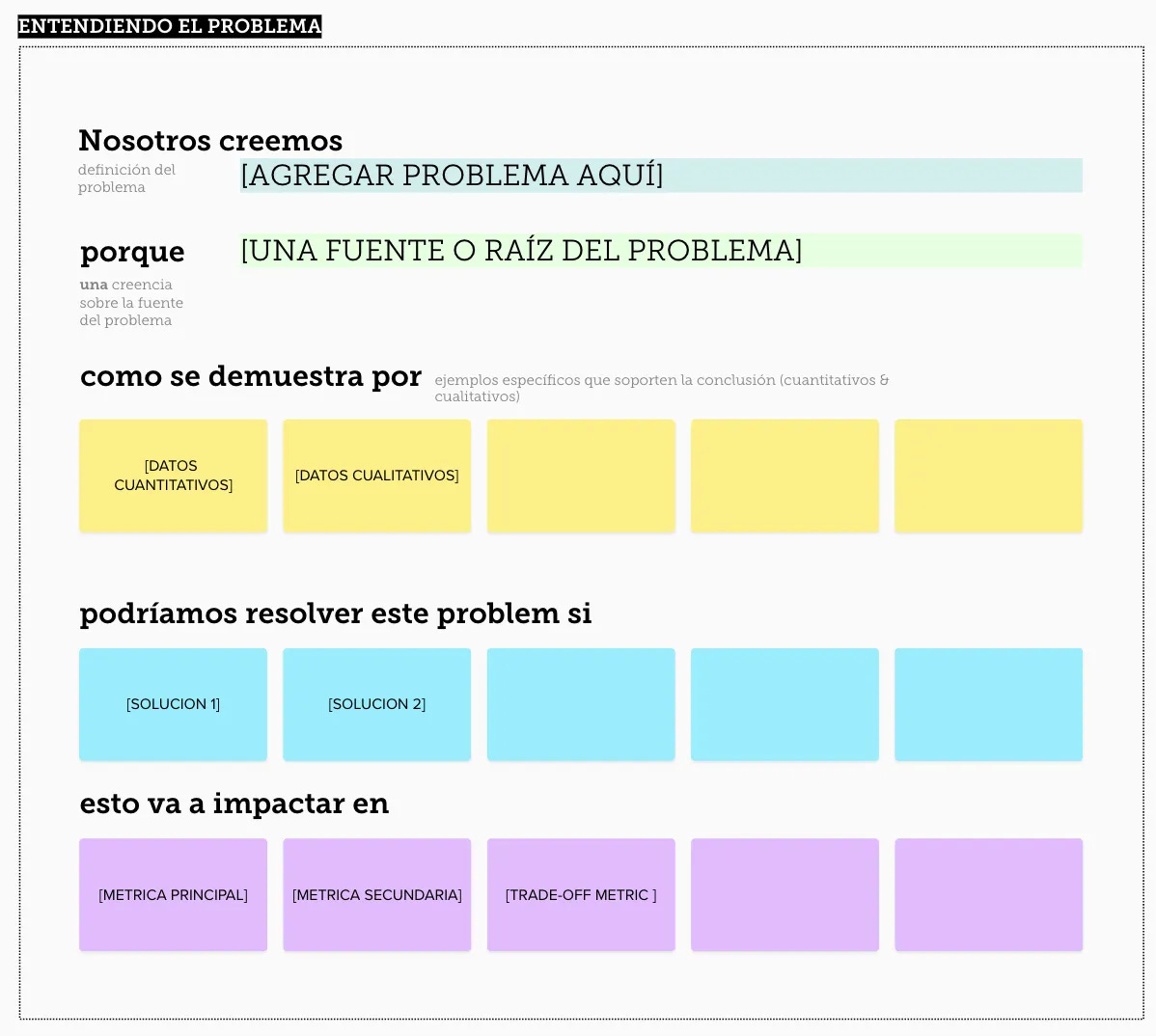 Definir muy bien el problema. Si no lo haces, puedes perder meses y afectar miles de usuarios. Acá va un template que me sirvió mucho para eso.