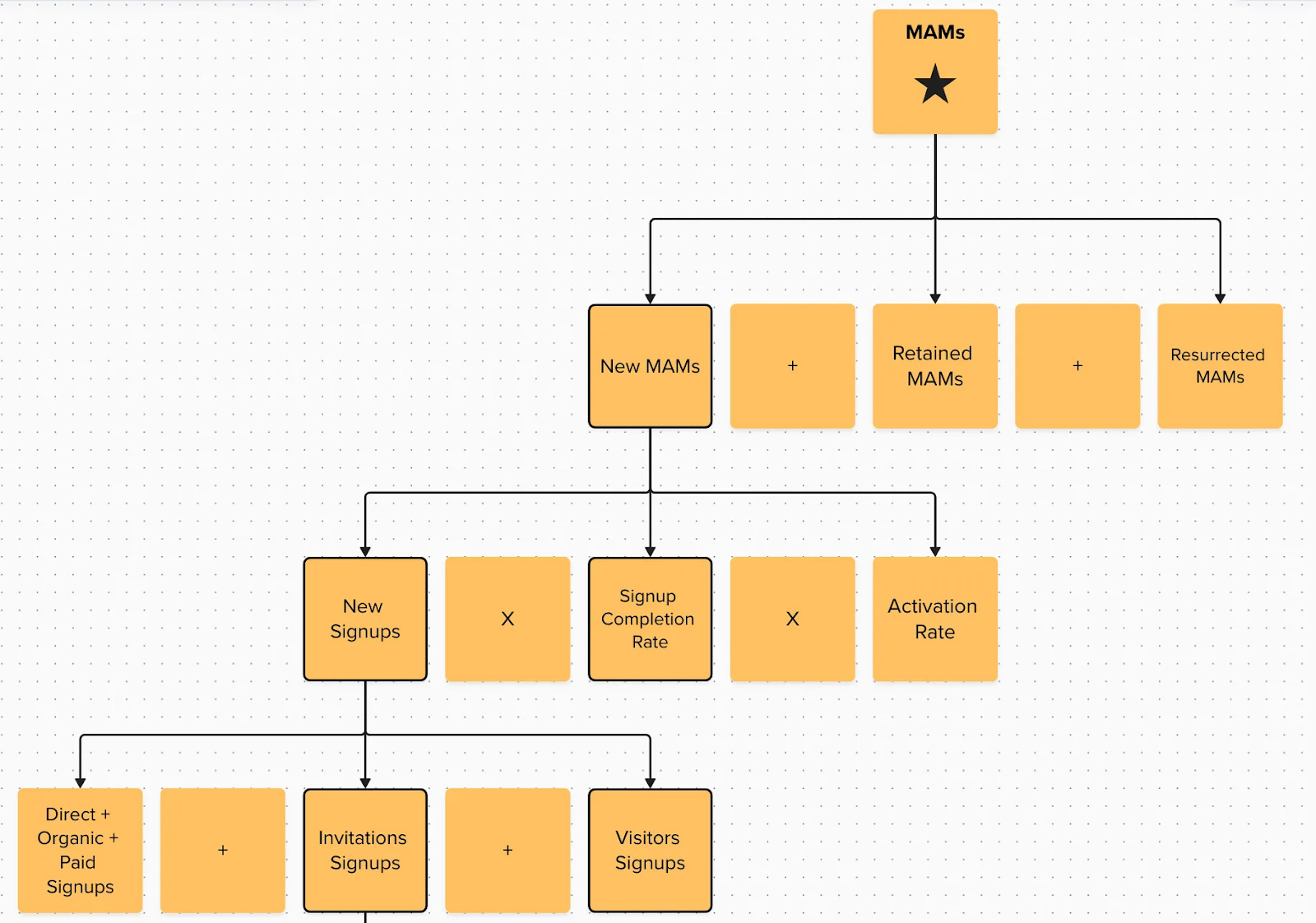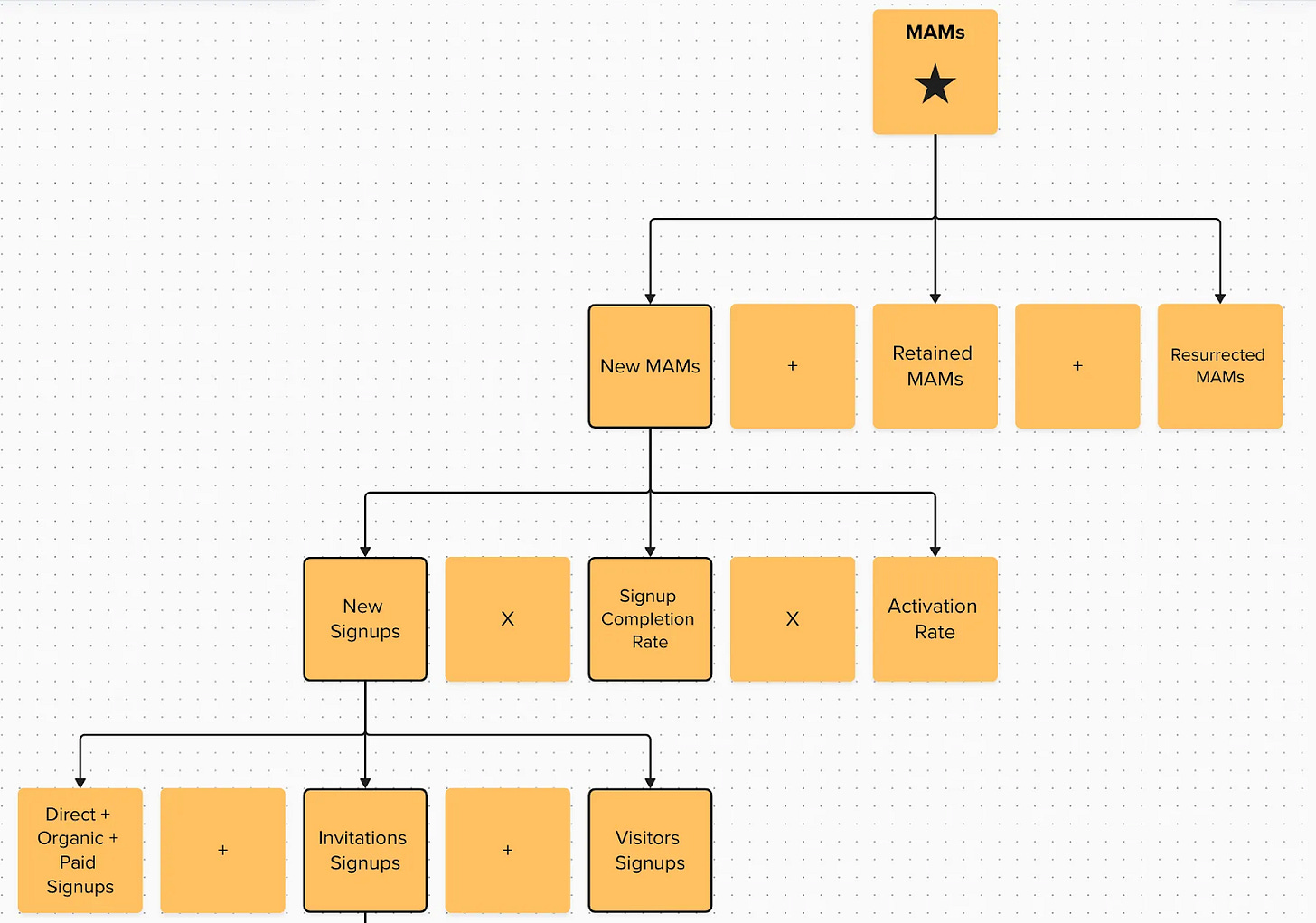 Acá te dejo un ejemplo real de MURAL descomponiendo MAM (Monthly Active Members) cuando era responsable del equipo de Adquisición y mi objetivo era New MAM