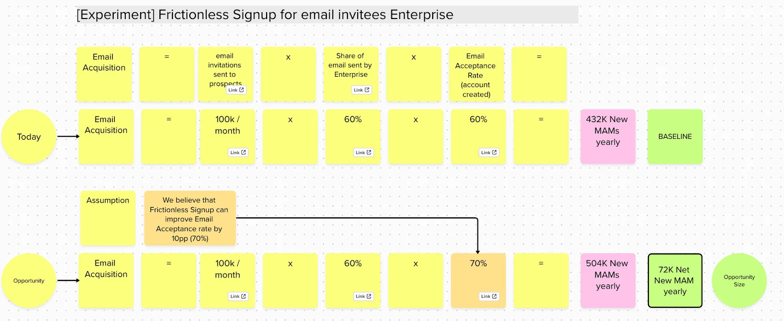 Establecer criterios de priorización. En mi caso, usé Opportunity Sizing para evaluar cada iniciativa según su impacto en la North Star Metric. Al principio fue MAM (Monthly Active Members), luego Self-Serve Revenue.